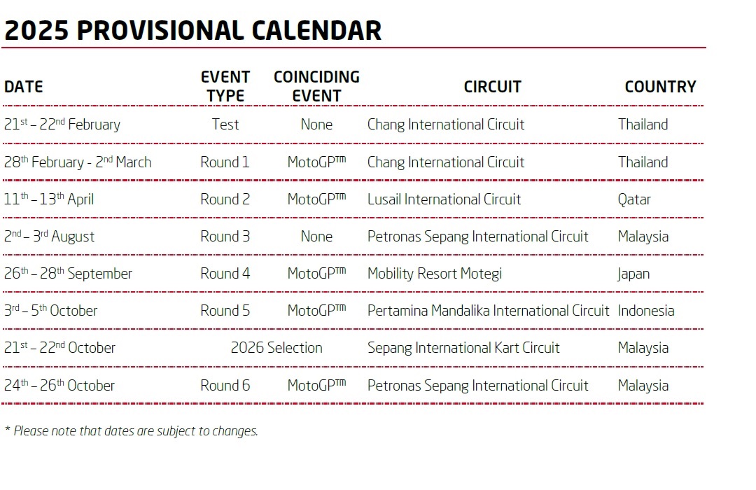 The season finale spans three critical rounds in October, all alongside MotoGP, with Round 4 alongside at Mobility Resort Motegi, Japan (26th–28th September), Round 5 at Pertamina Mandalika International Circuit, Indonesia (3rd–5th October), and a Round 6 finale back at Sepang International Circuit, Malaysia (24th–26th October).